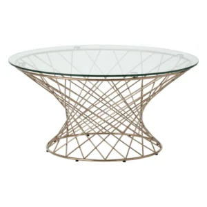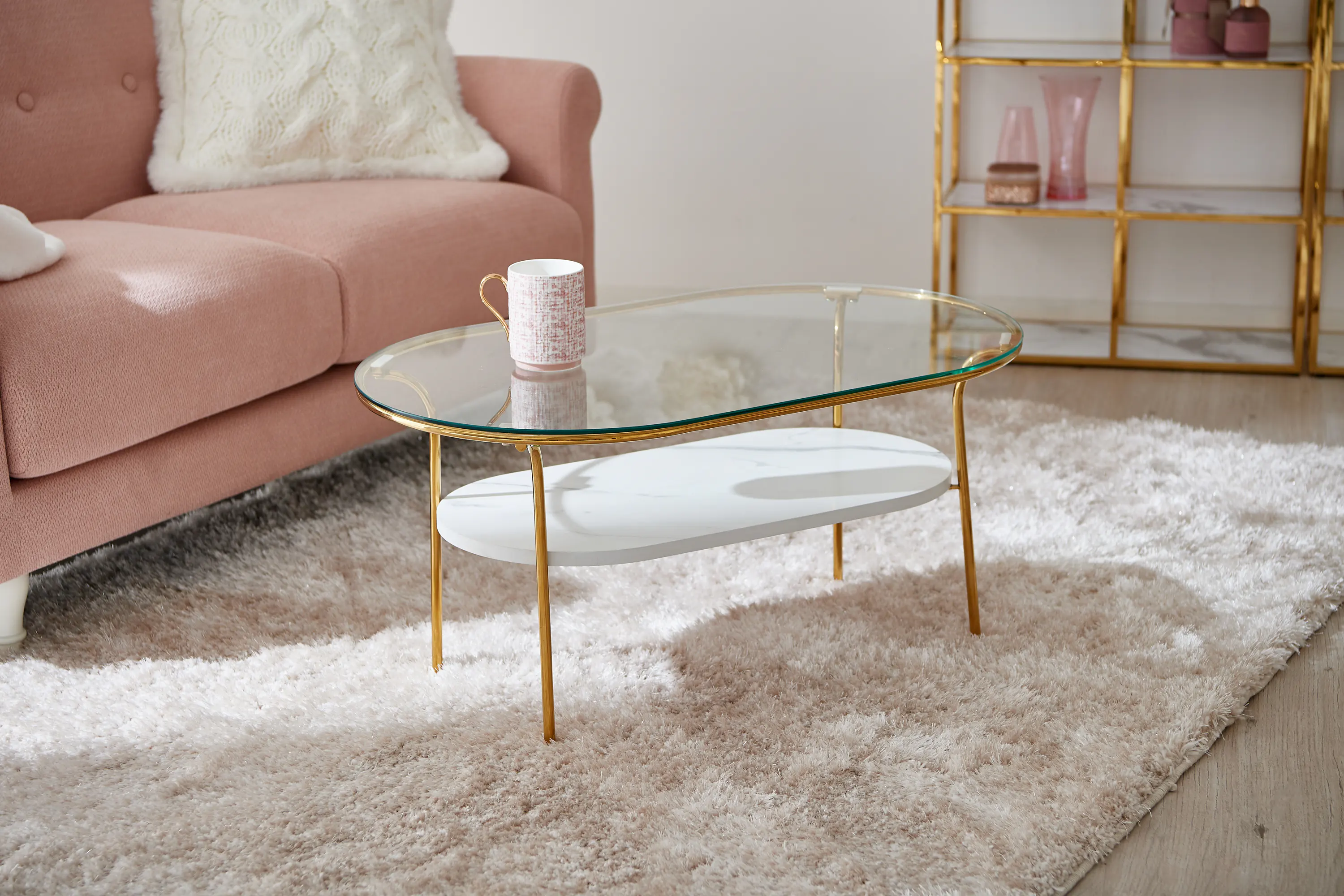 ガラス天板とフレームの組み合わせが選べるコーヒーテーブル。天板はクリア・ブラック、フレームはホワイト・ブラック・ゴールドが用意されています。脚部は複雑に編み込まれたデザインで、テーブルとの距離や角度で見え方が変わりお部屋のアクセントにもなります。フレームにしっかりとガラス天板を固定できる作りで日常使いも安心です。