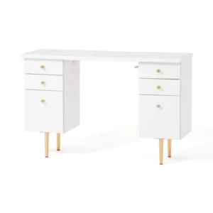 汚れに強い大理石柄のメラミン天板をはじめ、ゴールドの取手がゴージャスな収納力のある引出しに、ドライヤーやヘアアイロンが使えるコンセントがついた大容量の収納が魅力の大型ドレッサーです。別売りのLED付ミラーと一緒に使えばドレッサーにもなります。