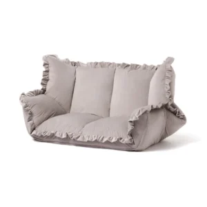起毛生地のフリルがかわいらしい二人掛けのフロアソファ。ワンルームでも使いやすい小ぶりなサイズ感が魅力です。背もたれ、背もたれ両サイド、肘掛け両サイドはそれぞれ14段階の角度調整可能で、フルフラットにして簡易的なベッドとしても使えます。低反発のチップウレタン使用のおかげでもっちりとした座り心地です。