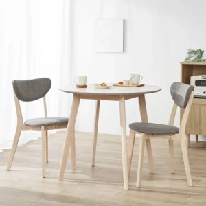 ダイニングテーブルセットで人気が高いのはコンパクトな3点セット。チェアは背面の曲線が特徴で、身体に添うようにフィットします。テーブルは円形と三角形があり、カラーはウォルナットとホワイト、チェアは織り生地とベルベット調生地の2タイプが用意されていますので自由に組み合わせが可能です。