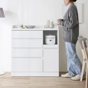 人気はミドルタイプで家電も食器も収納できるデザインです。スライド収納が多いAタイプと引き出しが多いBタイプがあり、カラーは7色と豊富に用意されています。見た目のかわいらしさだけでなく、大容量の引き出しや自由な稼働棚など実用性にも優れているため、評価の高いアイテムです。