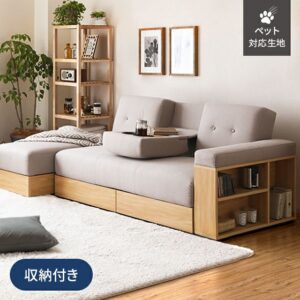 1台でソファにもベッドにもなる多機能ソファです。クッション、4つの大容量収納、ドリンクホルダーもついており張地はペットガード生地で傷に強いのがうれしいポイントです。サイズはコンパクト、レギュラー、ラージの3種類から、マテリアルはファブリックとソフトレザーの2種類から選べます。