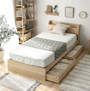 2杯の抽斗とフリースペースで合計322Lの収納スペースがあるベッド。ベッドボードには時計や小物が置ける棚やコンセントとUSBポートが備わっています。マットレスセットを選ぶと体圧分散に優れた高品質なコイル・理想的な寝姿勢にする8層構造・極厚25cmのWウレタンの3種類から選べます。