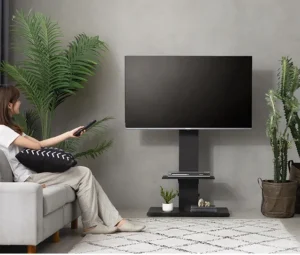 大型テレビを壁掛けのように設置でき、キャスターや可動式ラックがついた機能性も高いテレビスタンドです。6段階の高さ調節ができる上、チェアに座ったままでも見やすいハイスタイルで上下左右の角度調整も可能。自立式なので場所を選ばず設置でき、壁沿いだけでなくコーナー置きもできます。