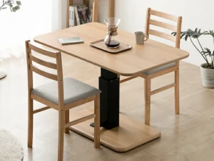 ペダルを踏むとガス圧昇降で無段階に高さ調節ができる昇降式テーブル。高さ次第でダイニングテーブルだけでなく、センターテーブルやデスクとしても使用できます。カラーはアッシュ・ナチュラル・ブラウンの3種類を用意。一本足でも強度に優れたスチール脚を採用し、天板は天然木のような木目調が施されています。