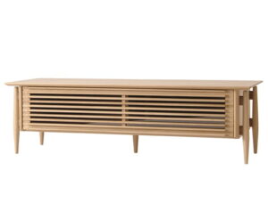 日進木工のテレビボードは床面にベタっと置くタイプではなく、お掃除用ロボットが入るようにどれも10センチ程度の脚が取り付けられています。ベーシックな木目のタイプの物が多く、控えめなデザインながらも機能性を考慮して作られています。