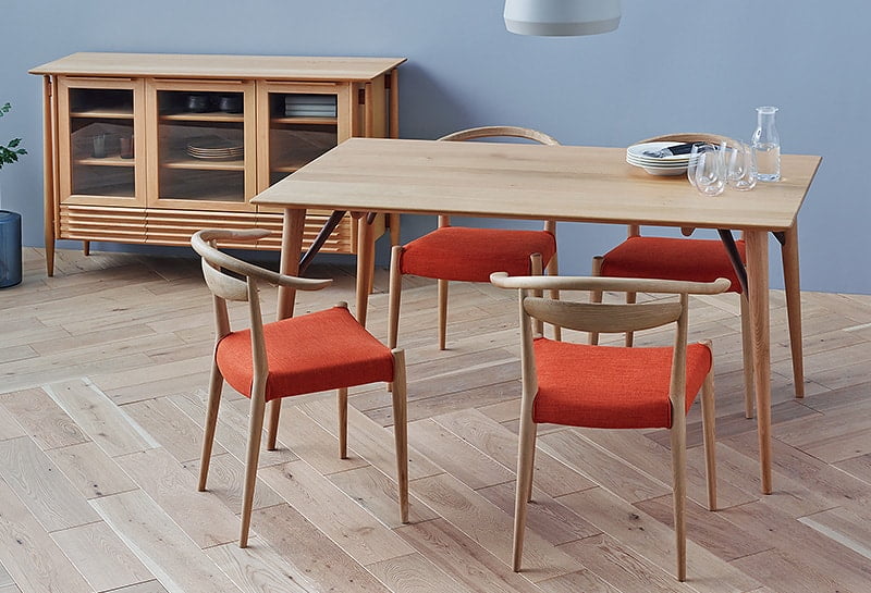 日進木工が創業当時から主力製品としているダイニングチェアが一番人気です。シンプルながらも使用する木の素材感を出ているのが特徴で定番のスタイルからナチュラル系や北欧系と合わせやすく、良質ながらもコストパフォーマンスに優れています。