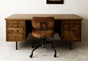 「ヒゲの机」という意味を持つウィスカーズ・デスクは、お偉いさんが座るのにふさわしい風格を備えています。壁に向かって設置するのもよいですが、デスクが持つムードを存分に発揮させるには、部屋の中央に向けての設置がおすすめです。