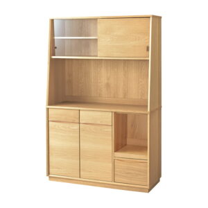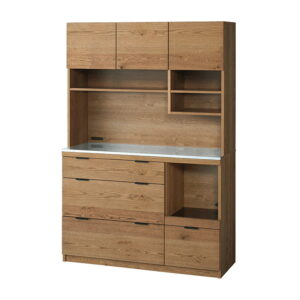 アディシリーズの特徴は使用する木材に節のある木材を使用し、各製品によって表情が異なる事がとくちょうです。食器棚やカウンター類には耐久性の高いステンレスが貼られており、お手入れが簡単な使い勝手の良さに加えてシャープな印象を与えてくれます。