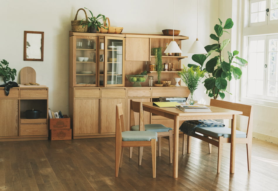明るい色目のナチュラルカラーが人気のシグネはダイニングやリビングを中心とした製品構成になっています。