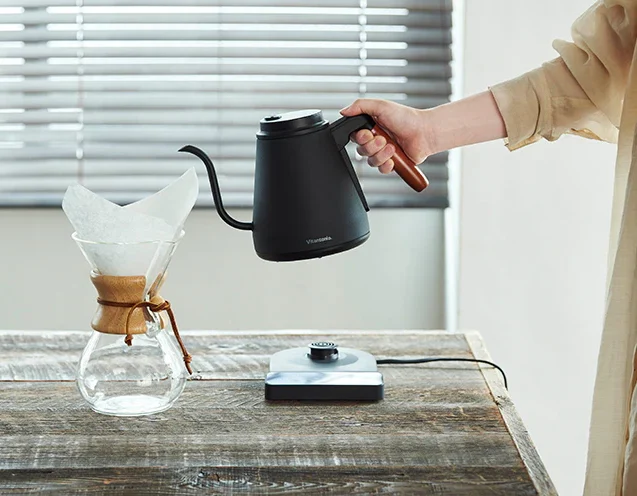 トップバリスタが監修した温調ドリップケトルです。細かな温度調節とこだわりの「バリスタ機能」でコーヒーの味と香りを引き出します。細口ノズルとハンドル角度の絶妙なバランスによって、持ちやすさと注ぎやすさを実現。お湯の温度を繊細にコントロールする温度調節機能も搭載しているため、いつでもかんたんに好みのコーヒーが楽しめます。