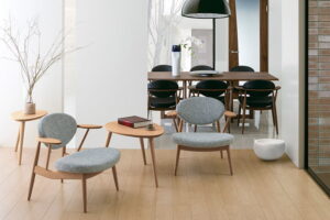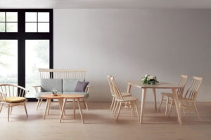 ケイ・ウインザーは飛騨の家具メーカーが得意とするイギリスのウインザー様式のシリーズで、柏木工独自の解釈の製品が作られています。ベーシックなクラウンチェアからソファやビーサロンチェアは柏木工の強みであるモダンデザインと融合し、新しいスタイルを生んでいます。