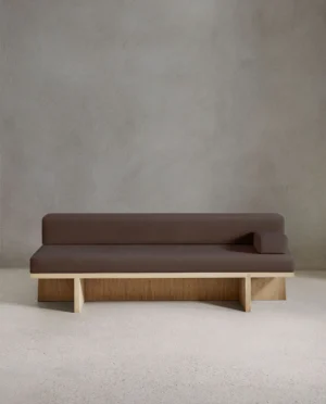 幾何学的なデザインと使い勝手の良さが共存するソファ。オーク材で作られた天板、クロス型の脚、オークのベニヤを張った多層モミ材で作られた縦脚で構成され、オーク材はワックスで仕上げられています。開いた木目や色の変化など経年変化が楽しめるタイムレスな魅力が込められています。