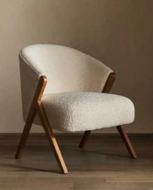 布地の表面に糸のループが浮かび出たブークレ生地を張地に採用したアームチェアです。もこもことした見た目からはフェミニンな印象を与えます。各脚の下部には、調節可能な緩衝材がついているため地面を傷つけません。脚にはラバーウッドを使用しています。