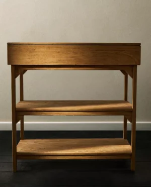 上部には抽斗、その下に2段の棚がある木製のストレージラックです。リビングに置いてもキッチンに置いても活用できるサイズ感となっています。原産地によって木目や色が異なるのも木製家具の魅力です。
