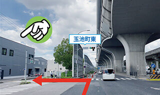 名二環をくぐると「玉池町」の交差点となります。左手にジェームスさん、右手にウカイ塗装さん(パンダのイラストが目印です)が見えたら右折し、国道302号線に入ります。