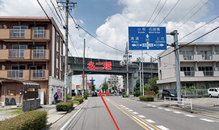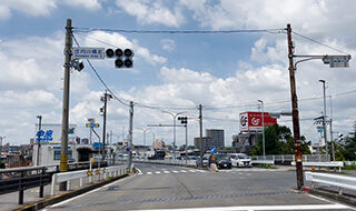 愛知県道63号線を北へ進んでいただくと、庄内川に差し掛かります。「庄内川橋北」を道なりに進み北上します。 川を渡った先左手には中京自動車学校さんが見えます。