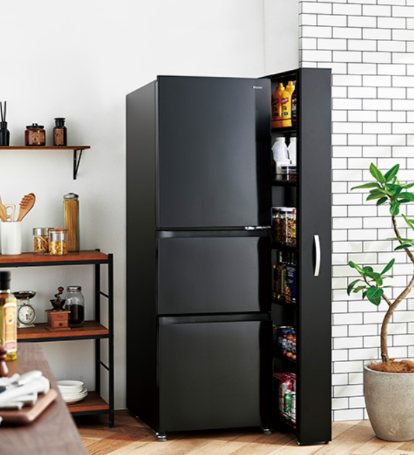 家族の人数が多くなるほど、大容量タイプの冷蔵庫が必要になります。しかし大容量タイプは、冷蔵庫のサイズが大きく、場所をとるのがデメリットともいえます。そこで注目されているのが、スリムなデザインだけど容量はたっぷり入るタイプです。片開ドアなので、狭いスペースにも置くことができます。