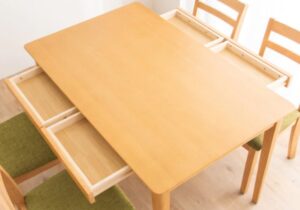 ダイニングテーブルの天板下に収納が付いているタイプはファミリー層に特に人気となっています。引き出しにはクロスやカトラリーが収納できるため、お子様でもさっと取り出せて日常使いしやすいのが魅力です。