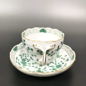花のレリーフが美しい「ロイヤルブロッサム」は、白いガマズミの花をモチーフに作られた「スノーボール装飾」が起源とされています。マイセン磁器の創始者であるアウグスト王の息子が、最愛のマリア・ヨゼファに、枯れない花を贈りたいという願いから誕生しました。
