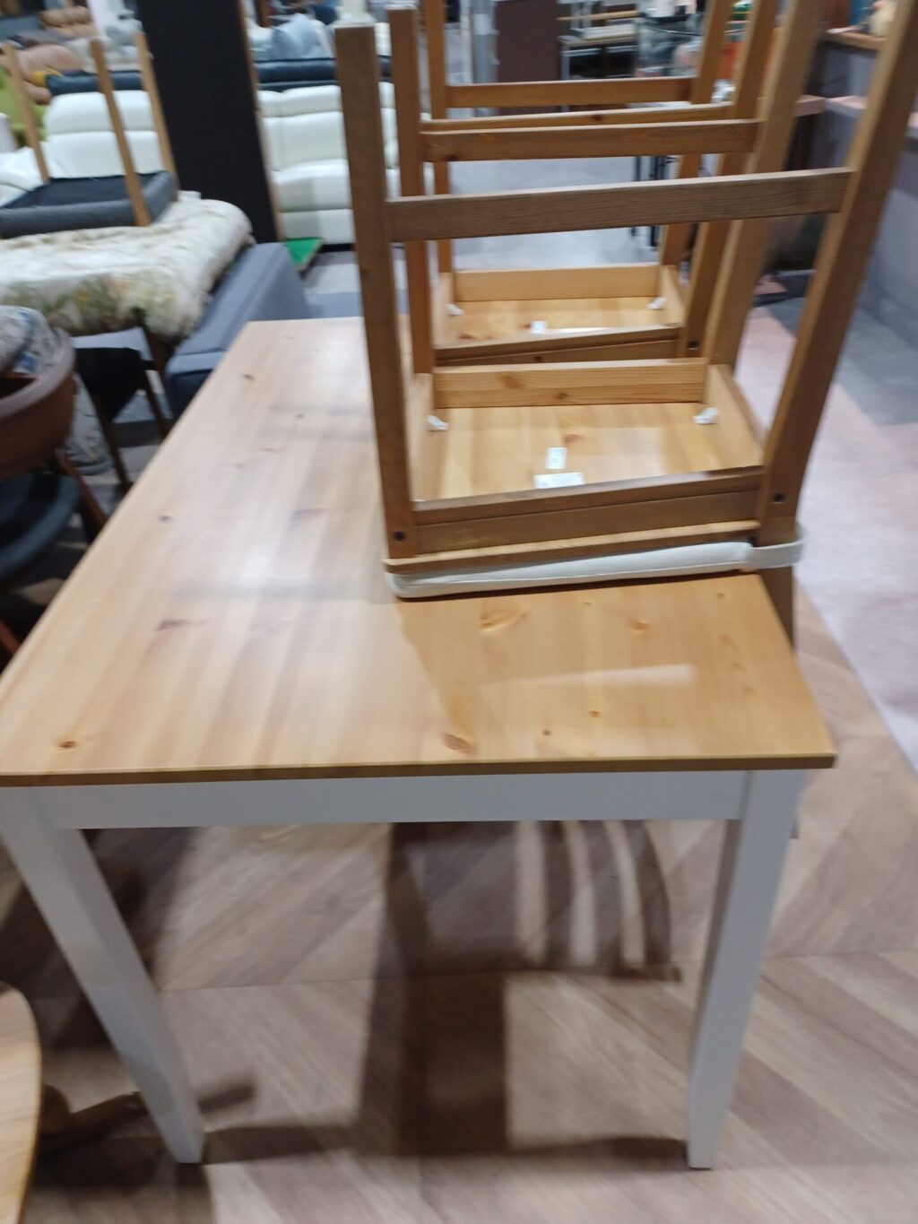 実際にお品物を拝見すると、大理石調の天板が印象的な高級感あるダイニングテーブルと、個性的な脚のデザインが目を引くチェアのセットでした。