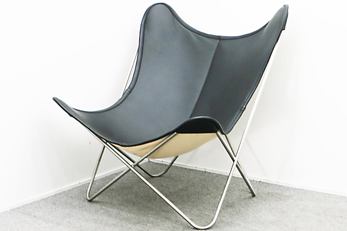 お品物はBKFチェアのリプロダクト品です。このBKFチェアですが歴史は古く1938年にアルゼンチンデザイナー3人によってデザインされました。彼らのイニシャルを取ってBKFチェアと名づけられましたこの製品は別名でバタフライチェアとも呼ばれています。歴史は古いものの当時は生地もナイロンやキャンバス地がメインで使われていました。